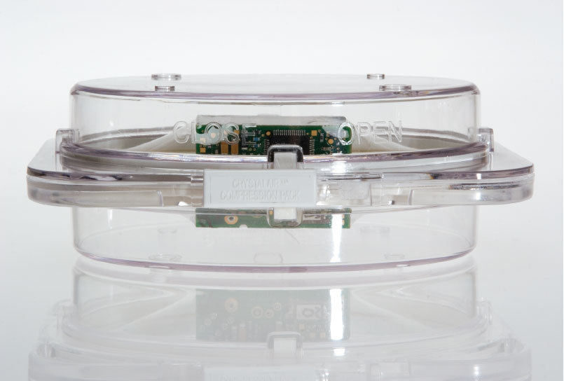 Crystalair® Compression brand membrane packs provide fully transparent protection for highly fragile and surface sensitive products. the product is gently suspended and immobilized between two layers of clear, inert, elastic film. The film is adhered to individual frame structures that are mounted within a clear, re-closeable injection molded container that features a positive lock closure.